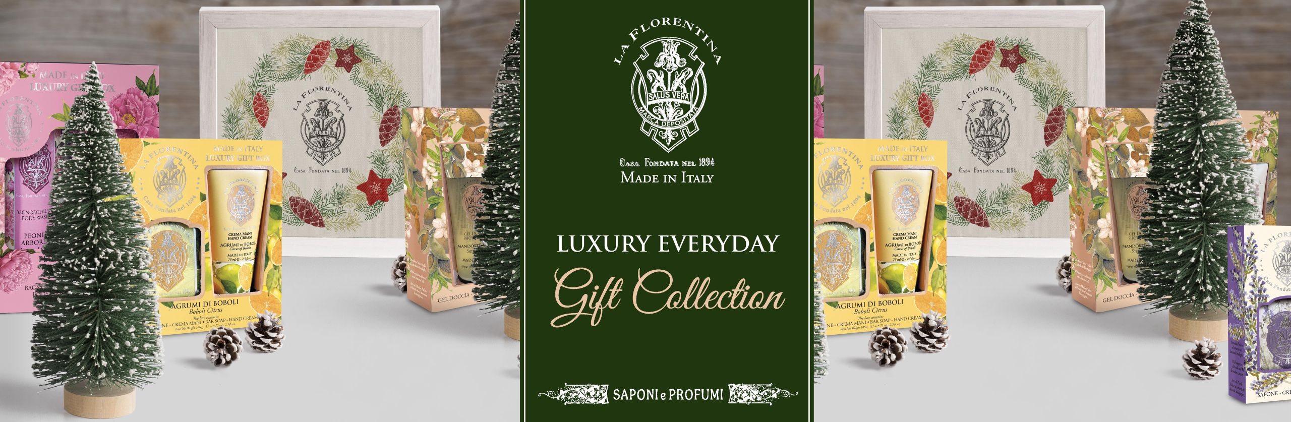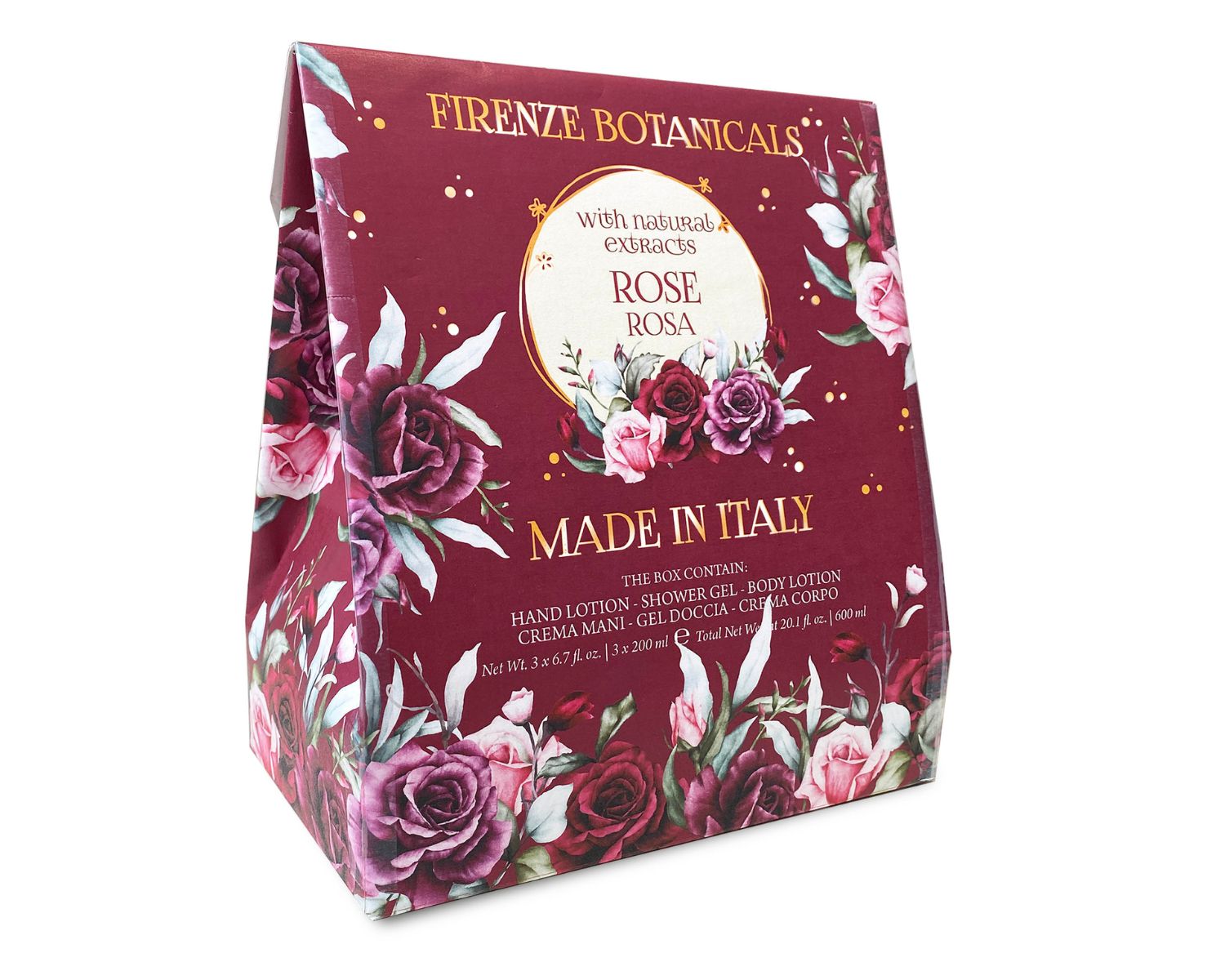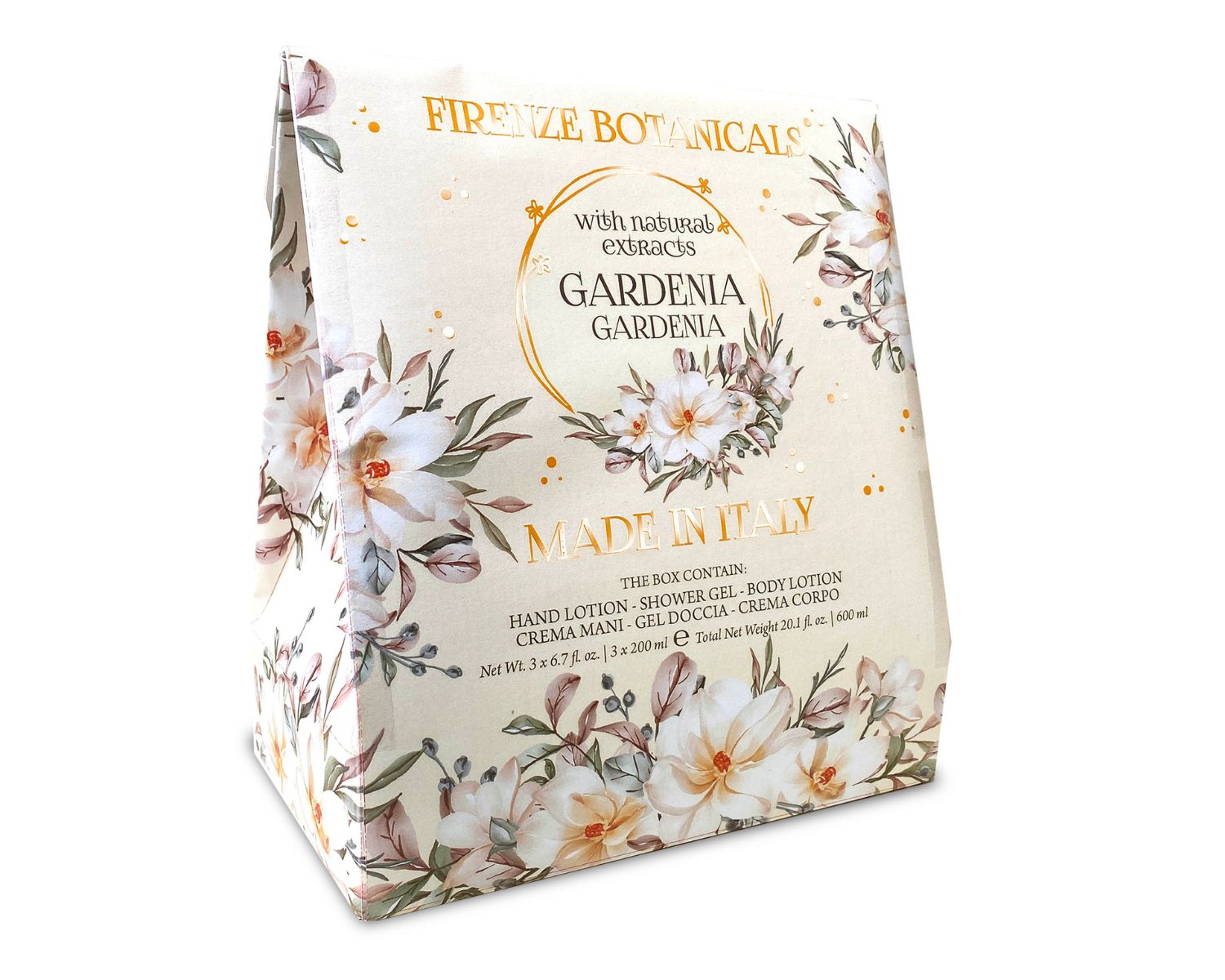 Gel Doccia 200 ml 6.7 fl. oz. | Crema Mani 75 ml 2.5 fl. oz. | Sapone Incartato 106 g 3.7 oz.