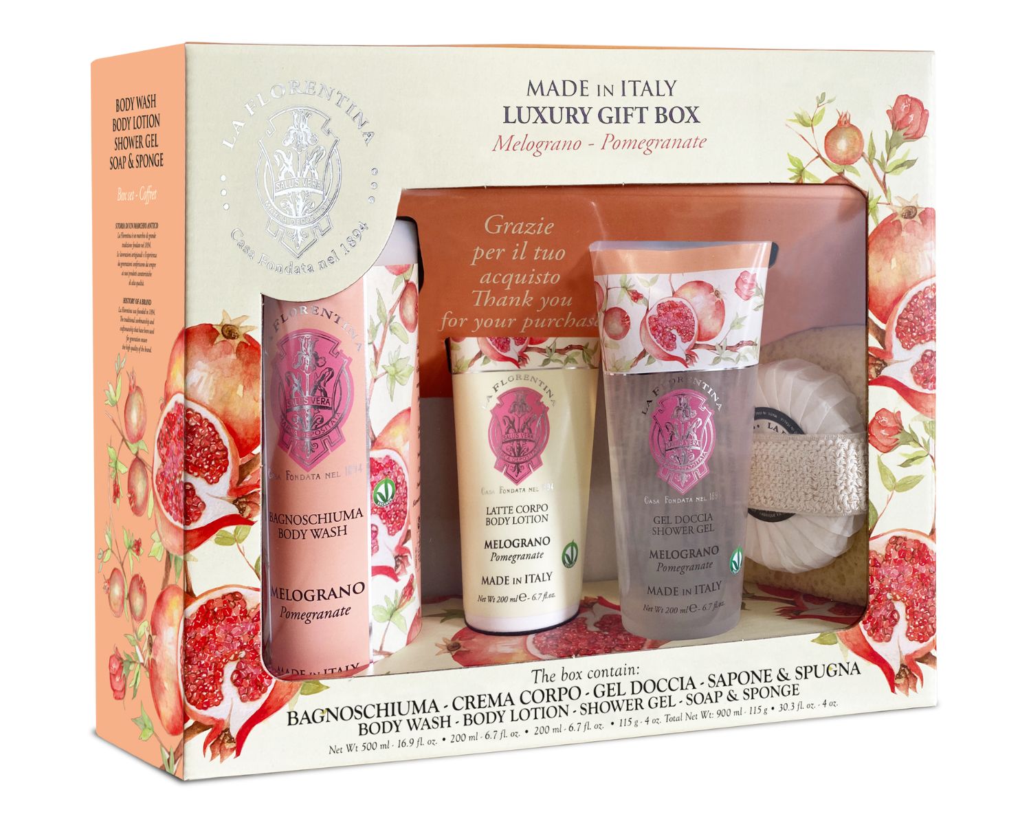 Il set contiene una saponetta, una crema mani e un gel doccia con Melograno & Uva Rossa.