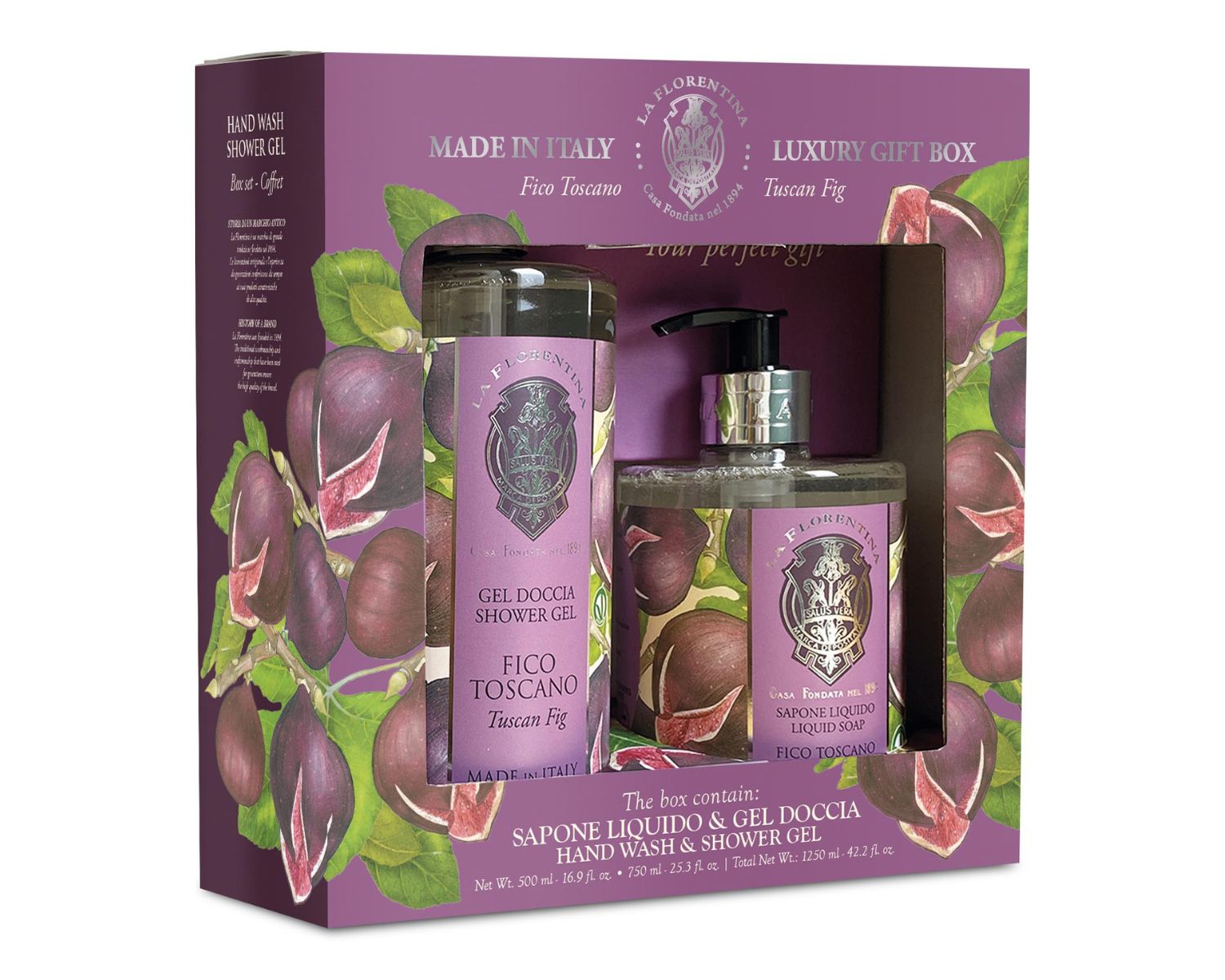 Il set contiene una saponetta, una crema mani e un gel doccia con Fico & Mandorla.