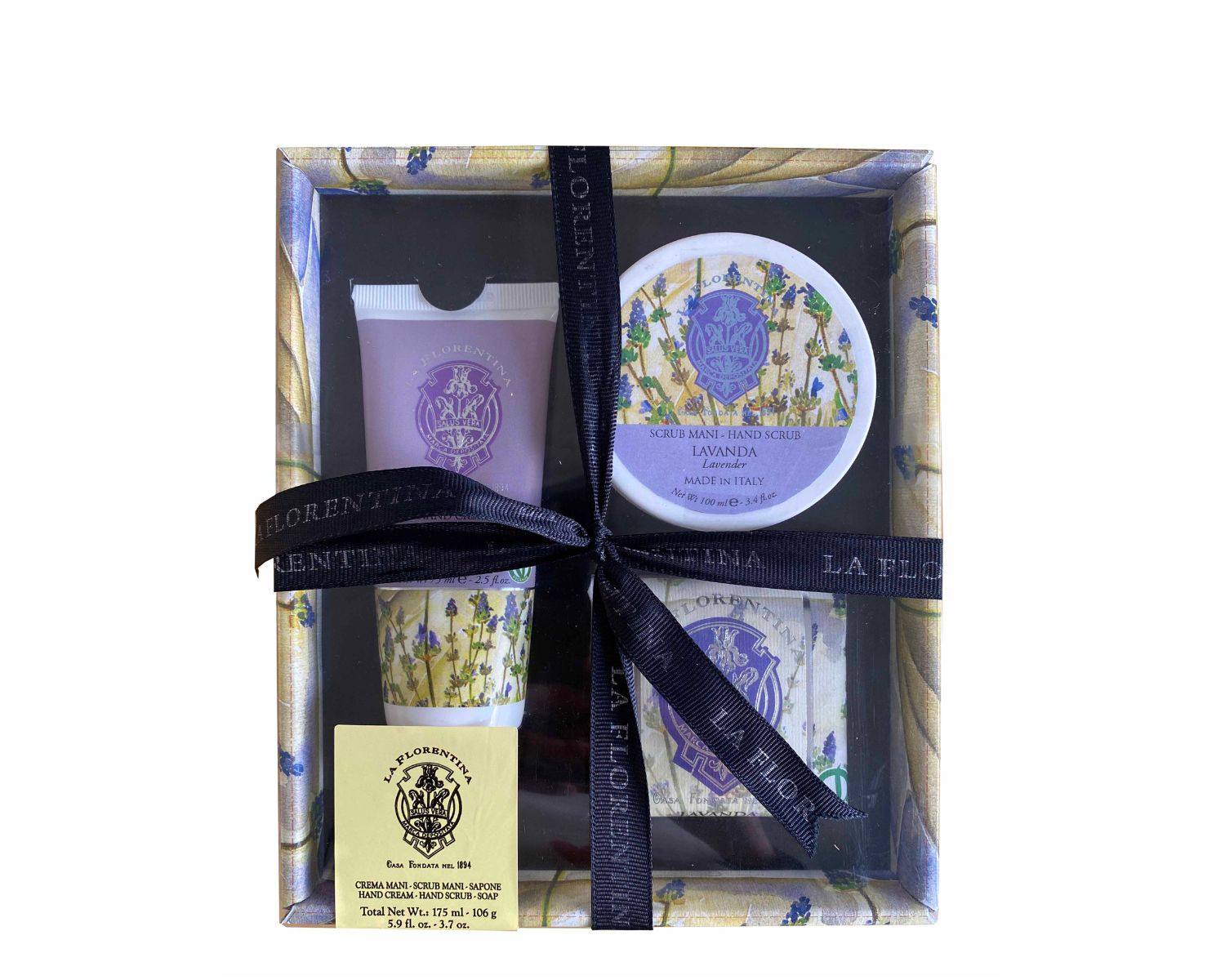 Il set contiene una saponetta e una crema mani con Iris di Firenze & Lavanda.